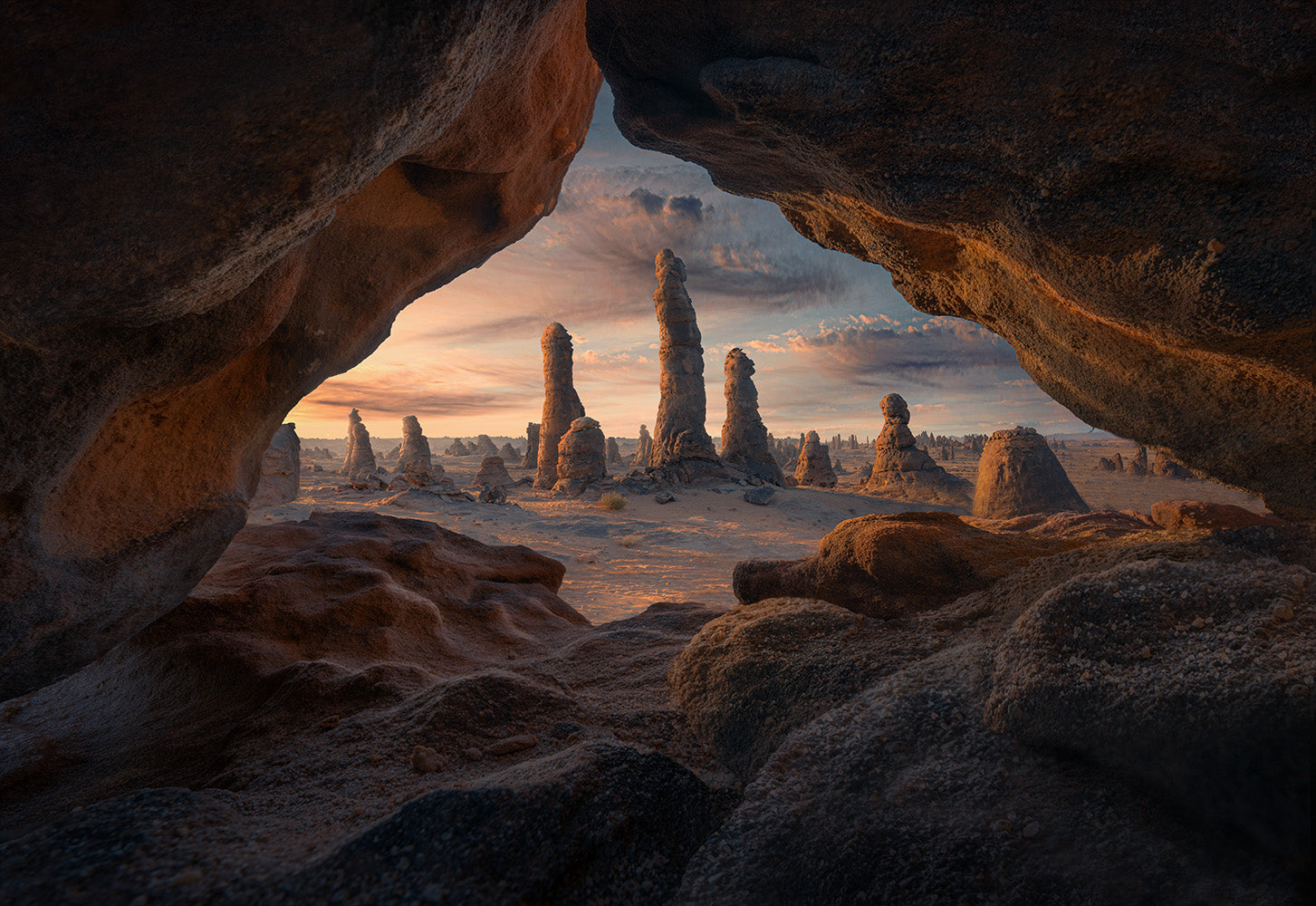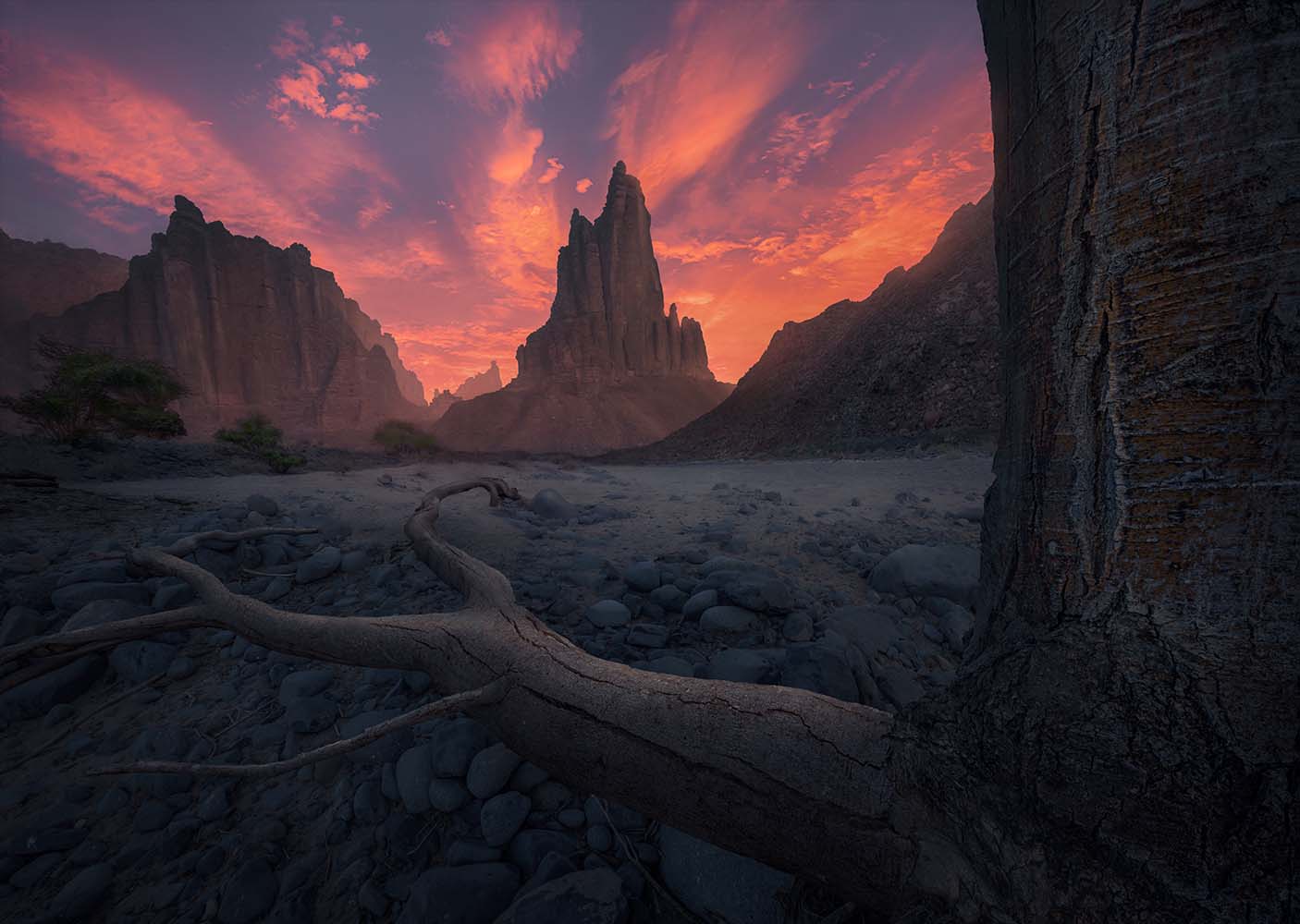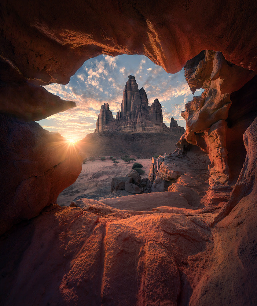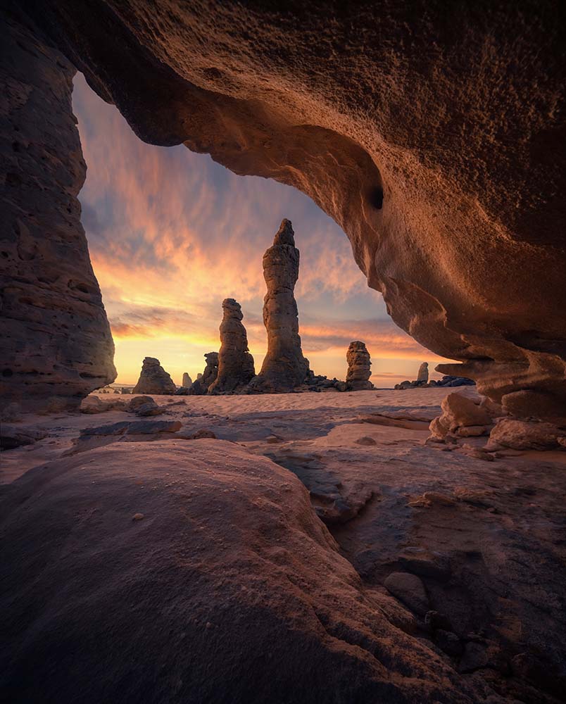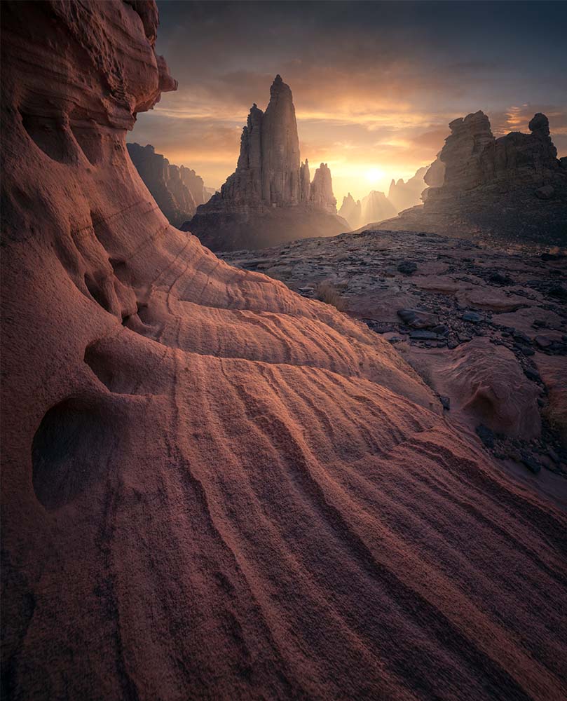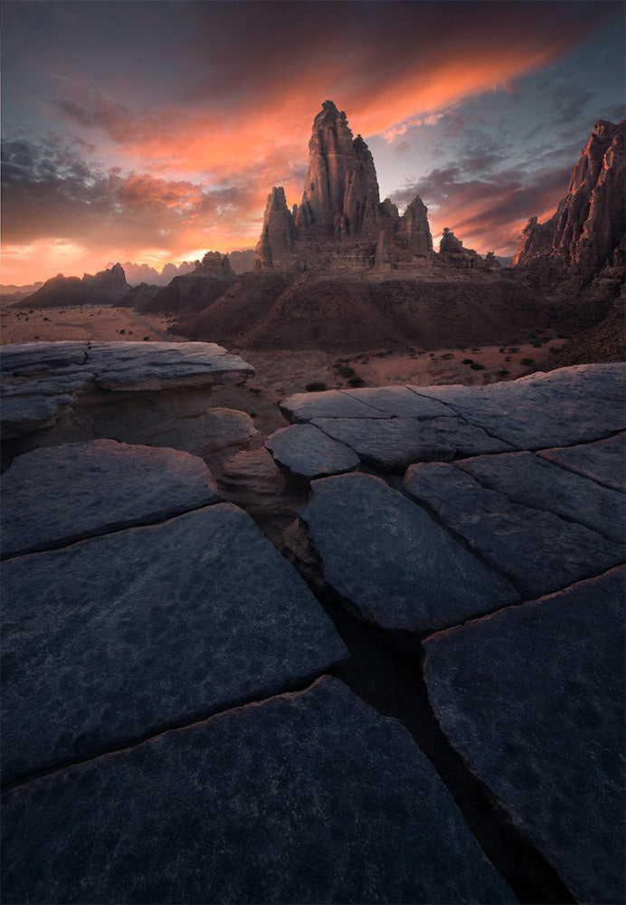 After breakfast, we’ll check out and head to Wadi Al Disah for a stunning sunset shoot. We’ll photograph a beautiful mountain, using caves, leading stone lines, and patterns in the rocks that resemble slabs of brownies. We may even find some cracked mud.