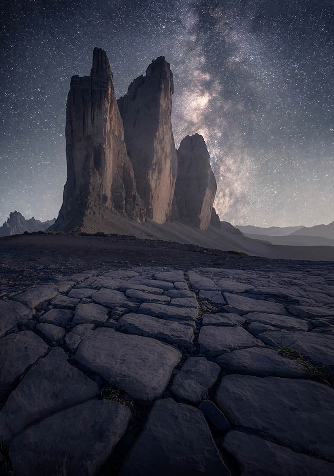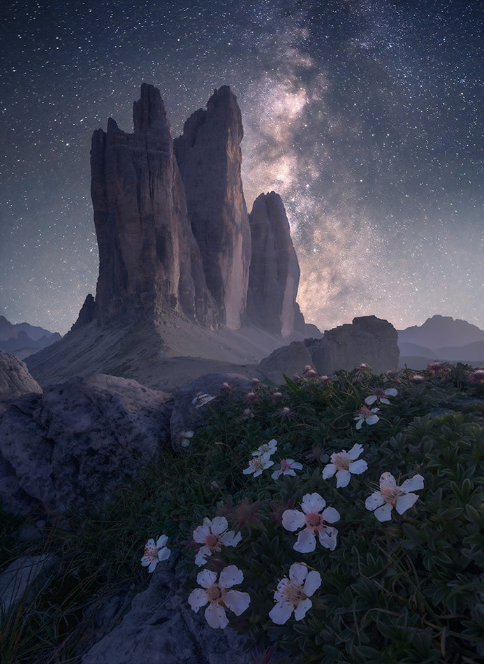 On the fourth day we will visit the beautiful Passo Gardena again. This place offers so many different compositions and spots, it can easily be visited two times. Also, the light will hit just as much of the mountains as during sunset - but just from the other side. After the sunrise it is time for breakfast, checkout, and moving to our next hotel. For sunset we will shoot the world famous Tre Cime Di Lavaredo - or in German, Drei Zinnen. We park the van at the high parking and start a one hour hike to our spot. The hiking trail is very wide and mostly flat - only the last section include a bit of ascending. We will shoot it from the side view - there are many flowers here and it will also line up with the milky way. We will most likely stay here a bit to shoot it during blue hour and possibly during the beginning of the night.