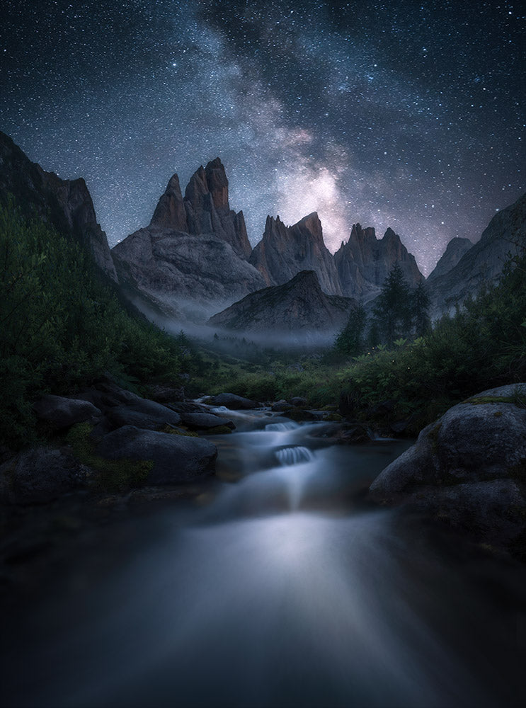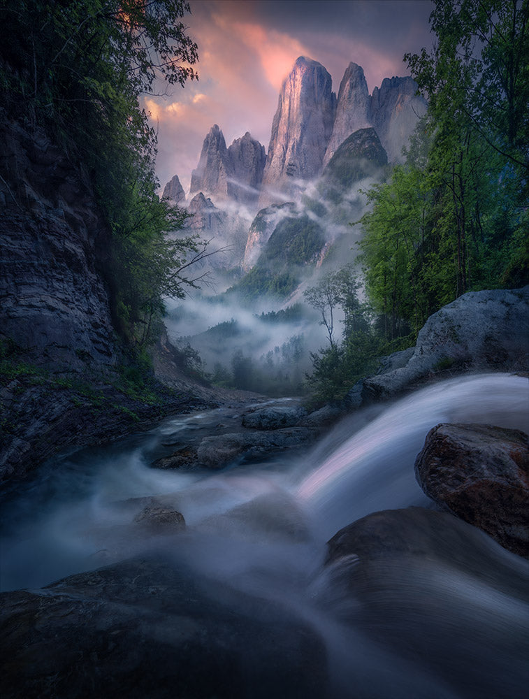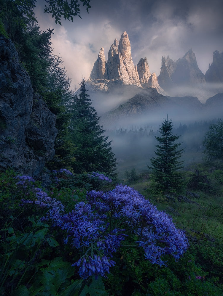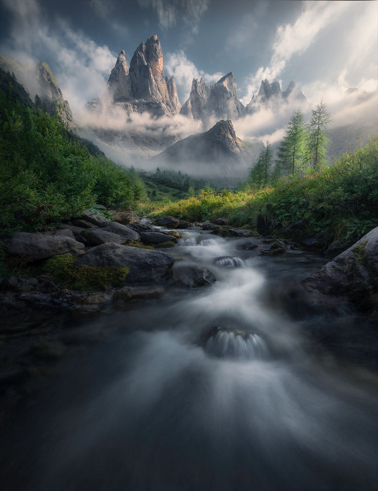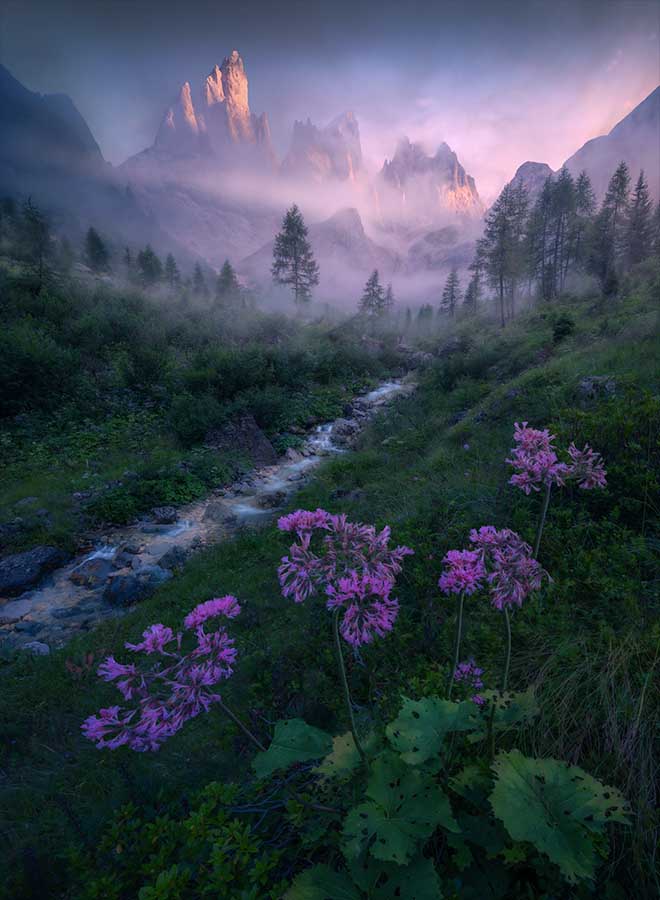 fairy tale-like valleys of the Dolomites. A fairy-tale valley surrounded by majestic mountains in this case. We have to hike for a good hour to reach this valley, but we will take plenty of time to reach it. Once in the valley we have shooting possibilities everywhere. From a forest view frame, a river, flowers and also the milky way. We will stay here till after sunset.
